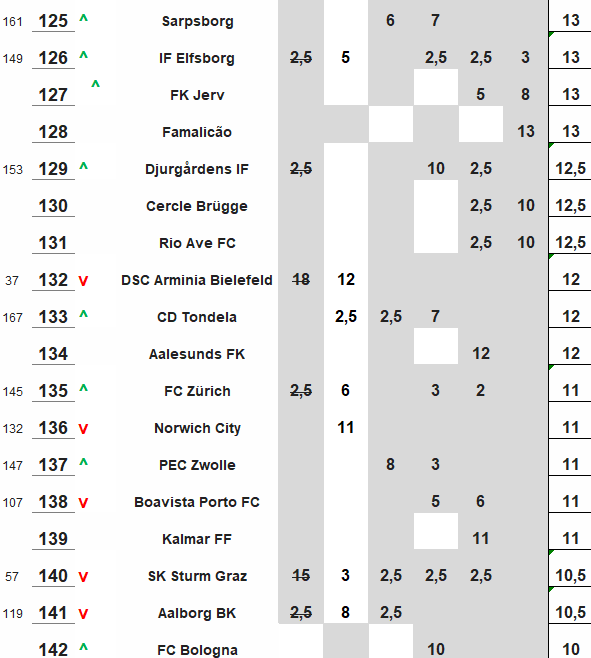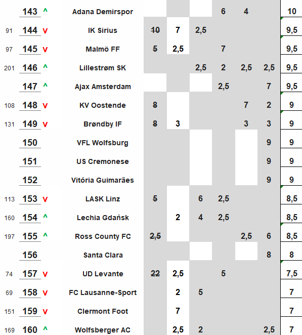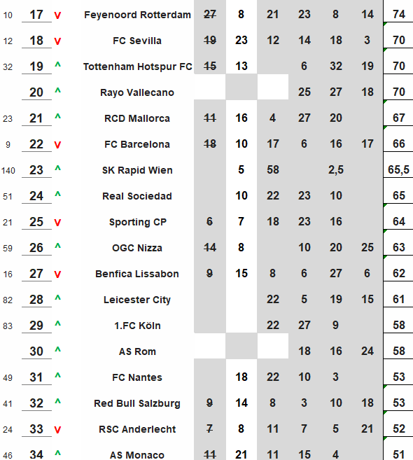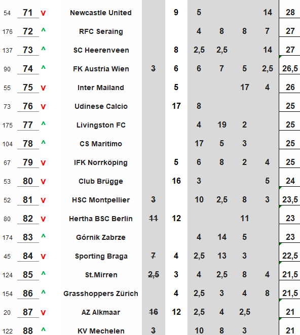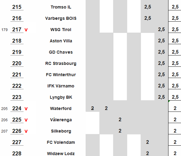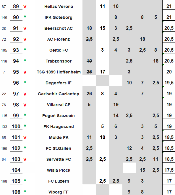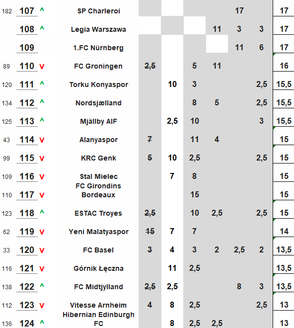 Alle Teams in der Gruppenphase der UEFA Europa League erhalten garantiert 3 Punkte (ohne die Punkte, die sie tatsächlich holen). Für ein Ausscheiden in der Qualifikation gibt es keine Punkte, da diese Klubs in die UEFA Europa Conference League wechseln und für die Teilnahme dort Punkte sammeln können.