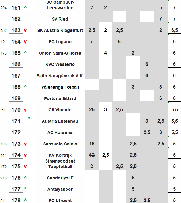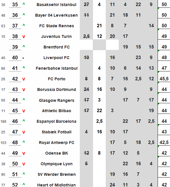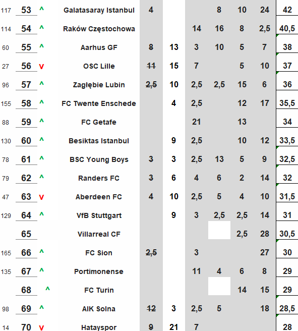 Für ein Ausscheiden in der Qualifikation gibt es keine Punkte, da diese Klubs in die UEFA Europa League wechseln und für die Teilnahme dort oder an der UEFA Conference League Punkte sammeln können.